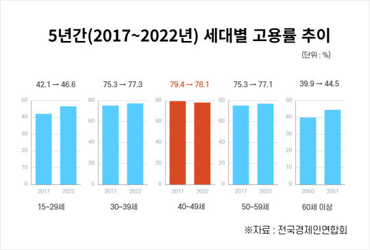 40대 고용률이 1.3% 감소로 전 세대중 유일하게 감소했다고 발표했다.